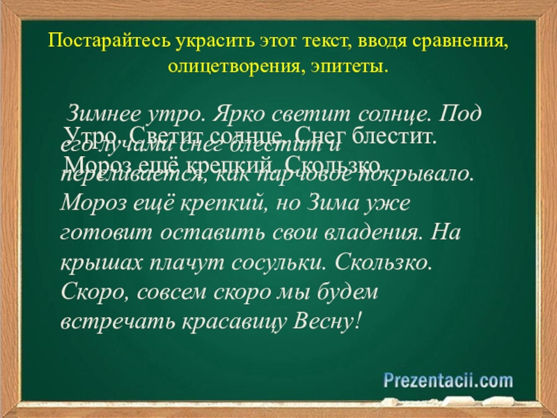 Зимнее утро. Ярко светит солнце. Под его лучами снег блестит и переливается, как парчовое покрывало. Мороз ещё крепкий, но Зима уже готовит оставить свои владения. На крышах плачут сосульки. Скользко. Скоро, совсем скоро мы будем встречать красавицу Весну!