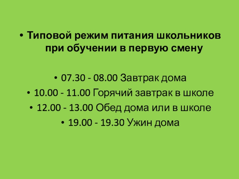 Слайд 12Типовой режим питания школьников при обучении в первую смену
