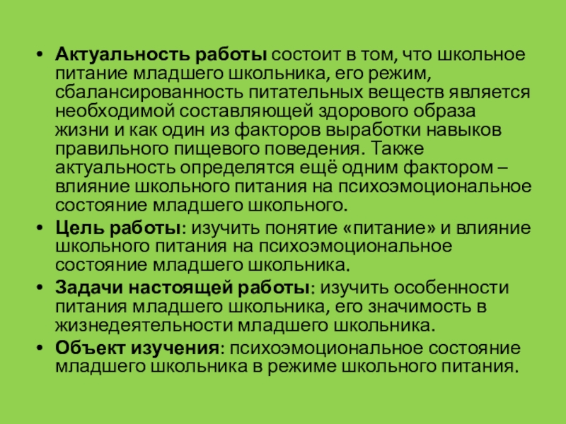 сбалансированность питательных веществ является необходимой составляющей здорового образа жизни и как один из факторов выработки навыков правильного пищевого поведения. Также актуальность определятся ещё одним фактором – влияние школьного питания на психоэмоциональное состояние младшего школьного.