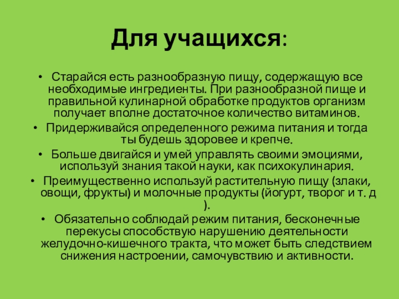 Старайся есть разнообразную пищу, содержащую все необходимые ингредиенты. При разнообразной