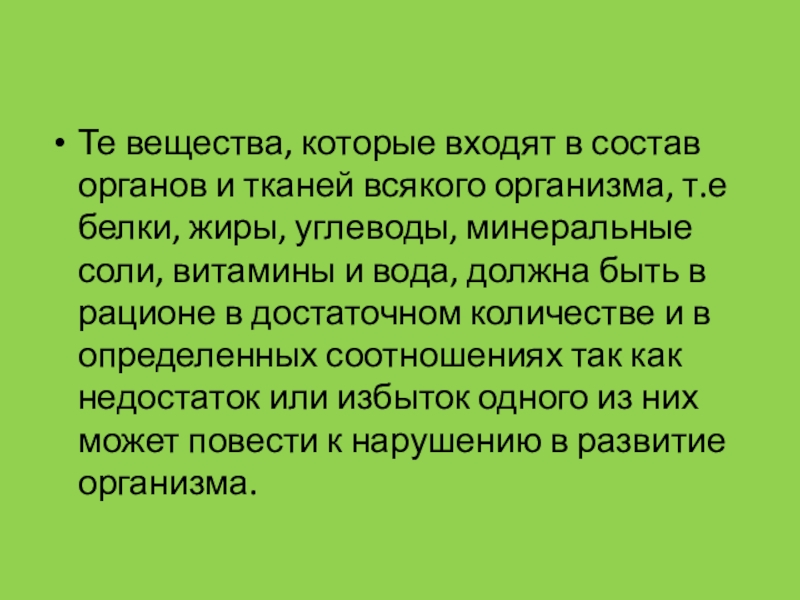 т.е белки, жиры, углеводы, минеральные соли, витамины и вода, должна быть в рационе в достаточном количестве и в определенных соотношениях так как недостаток или избыток одного из них может повести к нарушению в развитие организма.