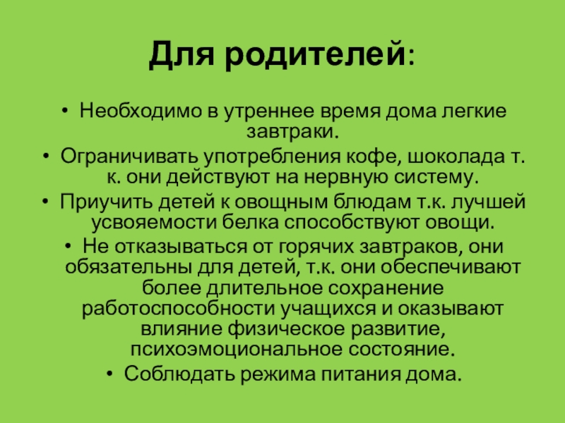 Не отказываться от горячих завтраков, они обязательны для детей, т.к. они обеспечивают более длительное сохранение работоспособности учащихся и оказывают влияние физическое развитие, психоэмоциональное состояние.