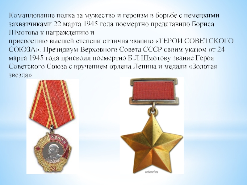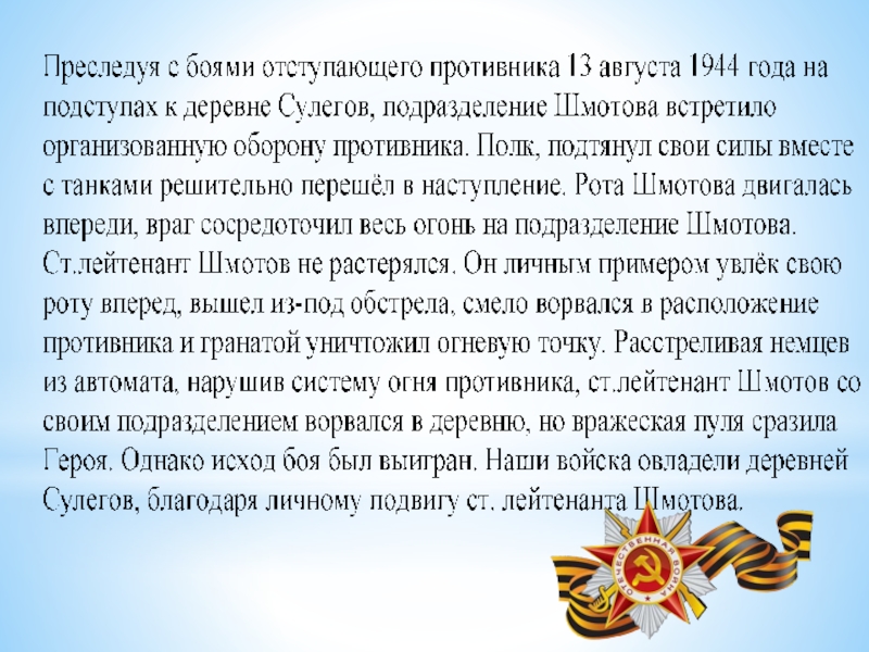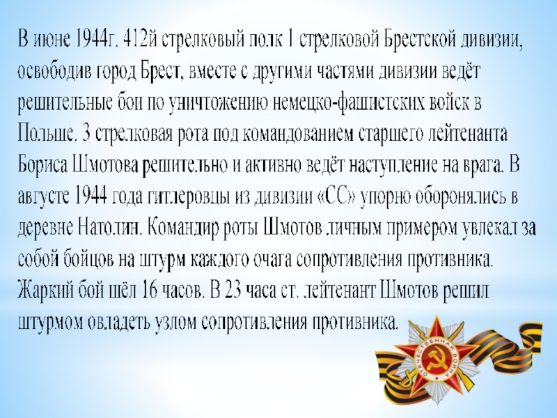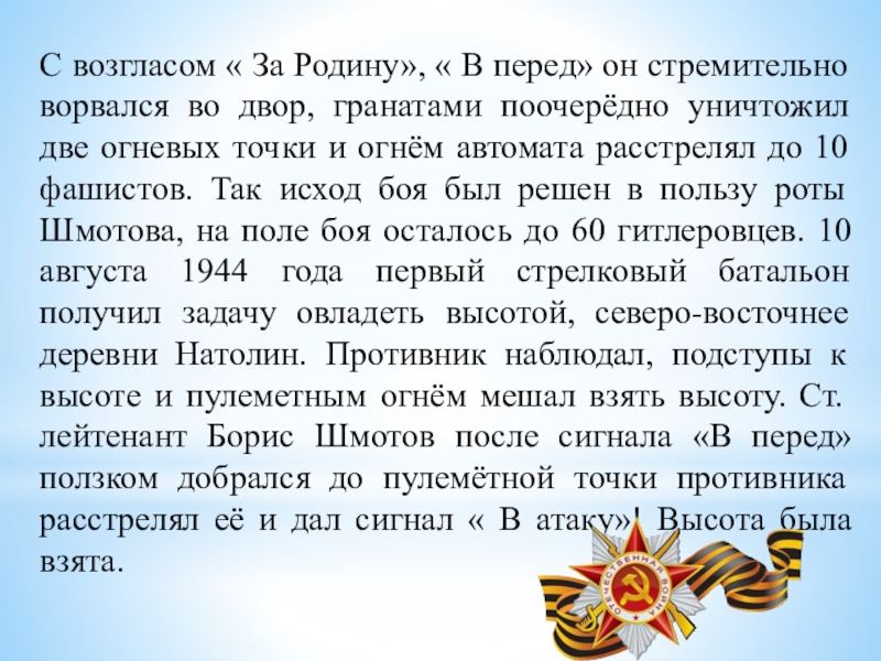 во двор, гранатами поочерёдно уничтожил две огневых точки и огнём автомата расстрелял до 10 фашистов. Так исход боя был решен в пользу роты Шмотова, на поле боя осталось до 60 гитлеровцев. 10 августа 1944 года первый стрелковый батальон получил задачу овладеть высотой, северо-восточнее деревни Натолин. Противник наблюдал, подступы к высоте и пулеметным огнём мешал взять высоту. Ст. лейтенант Борис Шмотов после сигнала «В перед» ползком добрался до пулемётной точки противника расстрелял её и дал сигнал « В атаку»! Высота была взята.