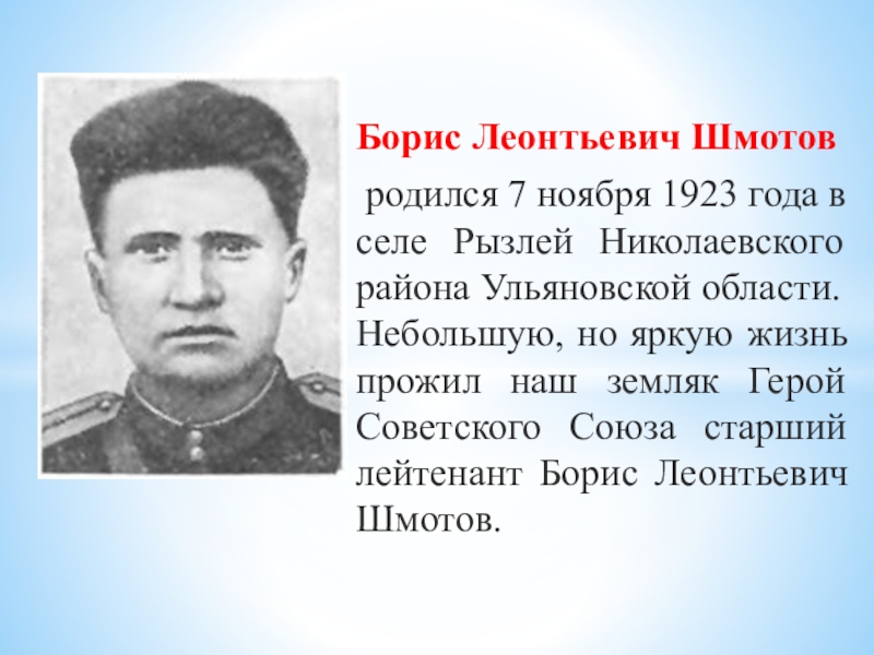 Николаевского района Ульяновской области. Небольшую, но яркую жизнь прожил наш земляк Герой Советского Союза старший лейтенант Борис Леонтьевич Шмотов.