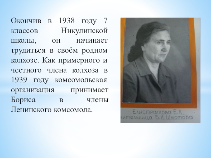 Слайд 3Окончив в 1938 году 7 классов Никулинской школы, он начинает трудиться