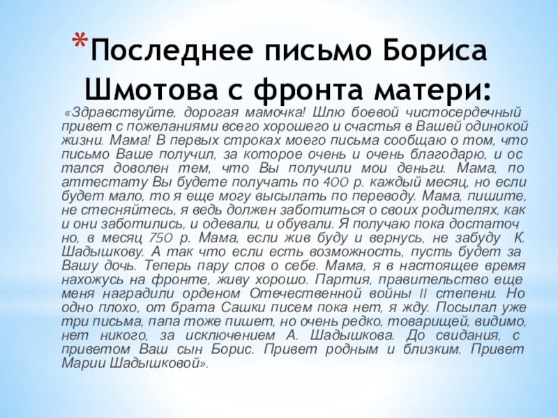 Слайд 11Последнее письмо Бориса Шмотова с фронта матери: