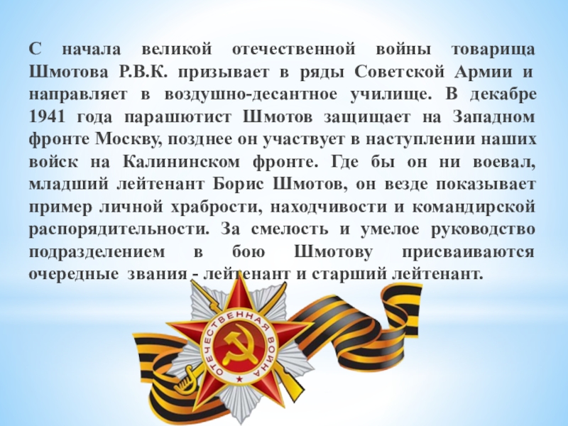 Слайд 4С начала великой отечественной войны товарища Шмотова Р.В.К. призывает в ряды