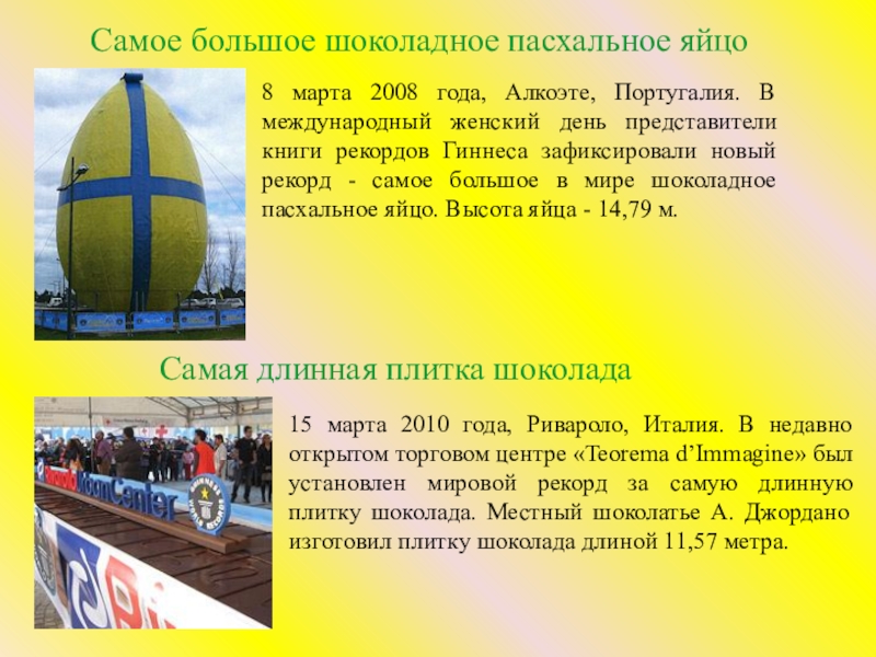 15 марта 2010 года, Ривароло, Италия. В недавно открытом торговом центре «Teorema d’Immagine» был установлен мировой рекорд за самую длинную плитку шоколада. Местный шоколатье А. Джордано изготовил плитку шоколада длиной 11,57 метра.