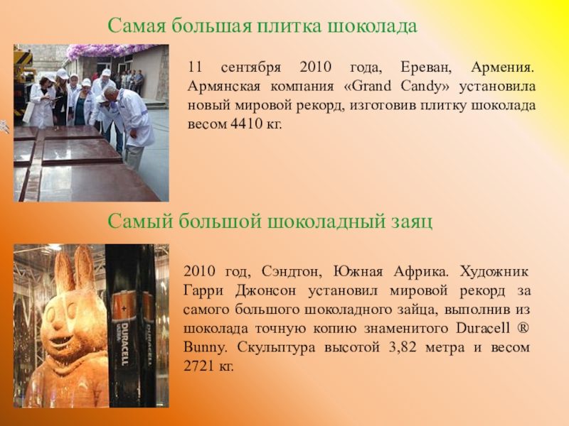 2010 год, Сэндтон, Южная Африка. Художник Гарри Джонсон установил мировой рекорд за самого большого шоколадного зайца, выполнив из шоколада точную копию знаменитого Duracell ® Bunny. Скульптура высотой 3,82 метра и весом 2721 кг.