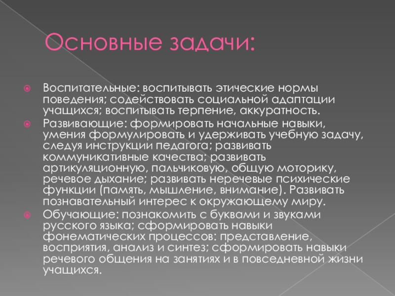 Обучающие: познакомить с буквами и звуками русского языка; сформировать навыки фонематических процессов: представление, восприятия, анализ и синтез; сформировать навыки речевого общения на занятиях и в повседневной жизни учащихся.
