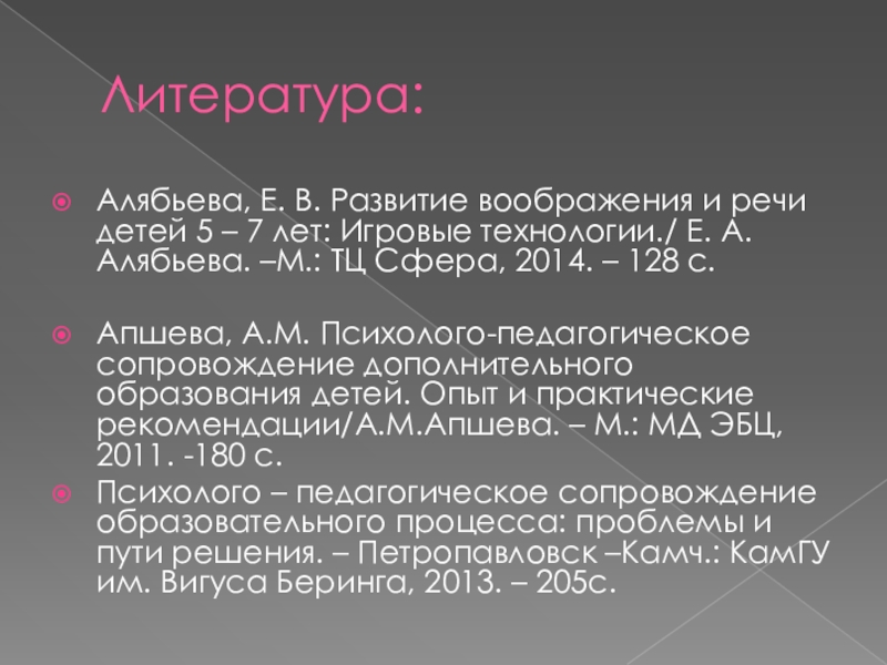 Апшева, А.М. Психолого-педагогическое сопровождение дополнительного образования детей. Опыт и практические рекомендации/А.М.Апшева. – М.: МД ЭБЦ, 2011. -180 с.