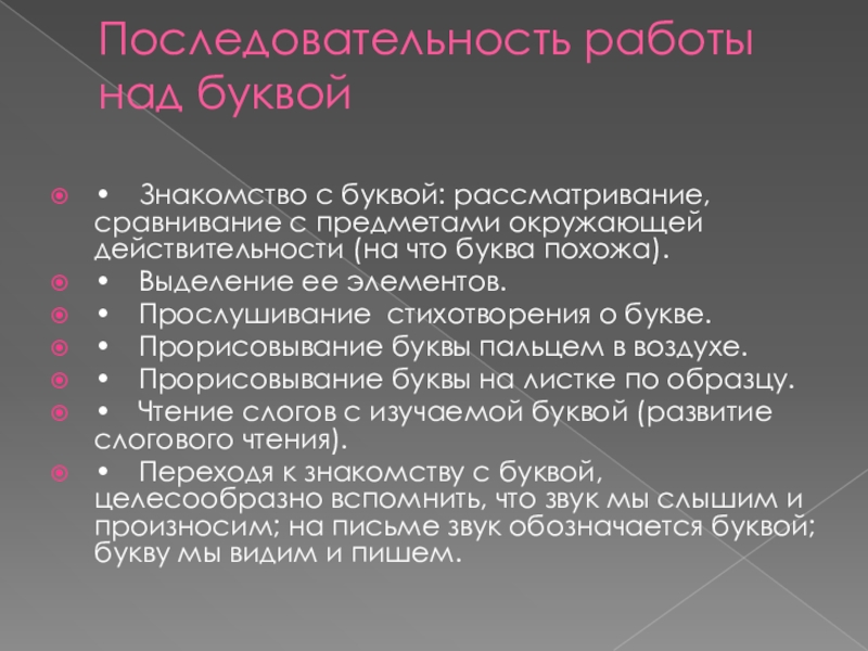 • Переходя к знакомству с буквой, целесообразно вспомнить, что звук мы слышим и произносим; на письме звук обозначается буквой; букву мы видим и пишем.