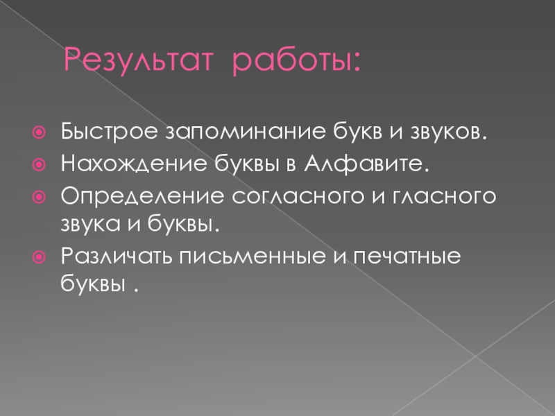 время в системе воспитания и обучения детей , который показал, что количество детей, имеющих проблемы в запоминании звуков и букв, неуклонно растёт. Необходимо создать основу для обучения грамоте в процессе работы по запоминанию звуков и букв.