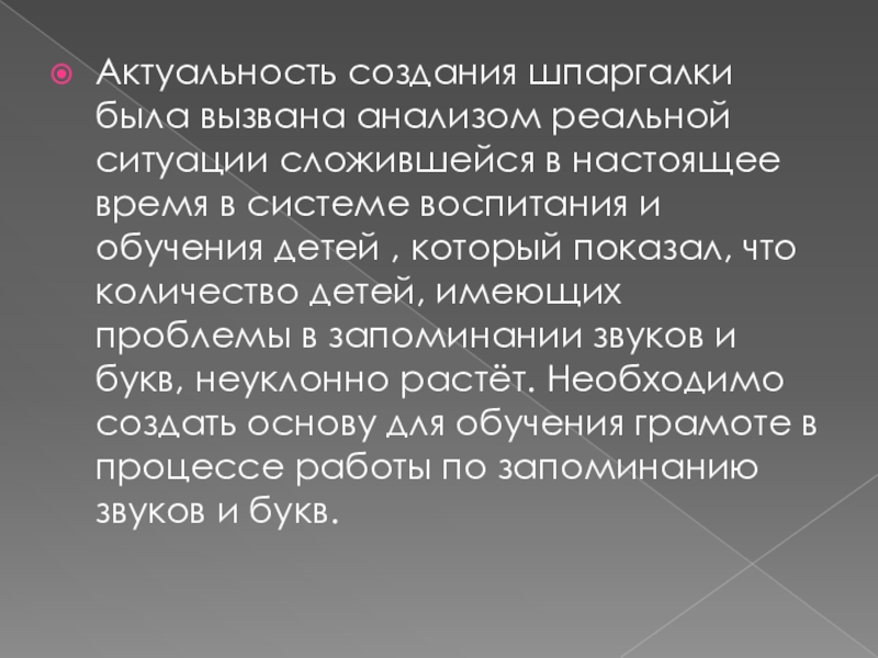 Слайд 3Актуальность создания шпаргалки была вызвана анализом реальной ситуации сложившейся в настоящее
