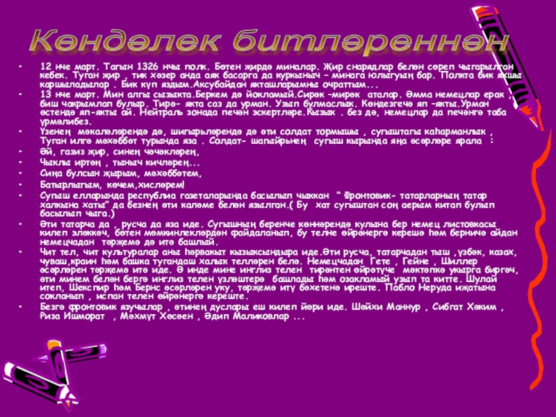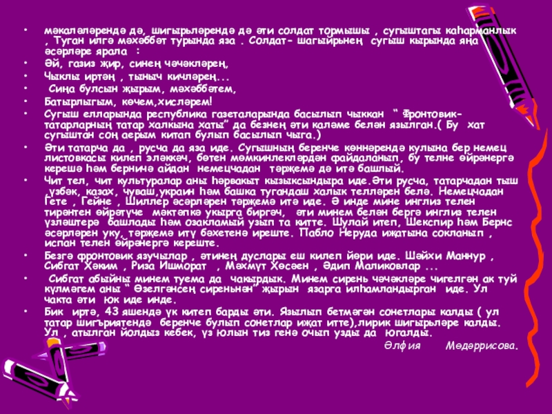 Туган илгә мәхәббәт турында яза . Солдат- шагыйрьнең сугыш кырында яңа әсәрләре ярала :