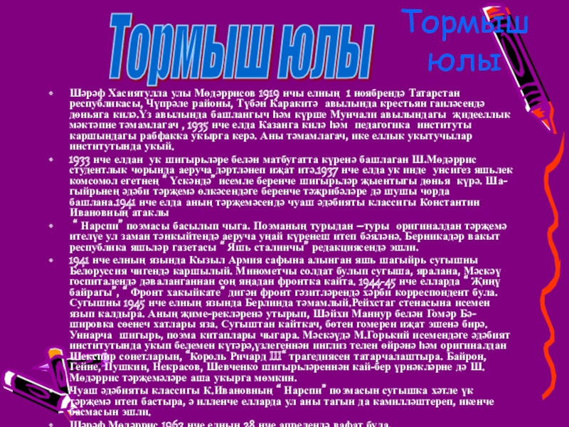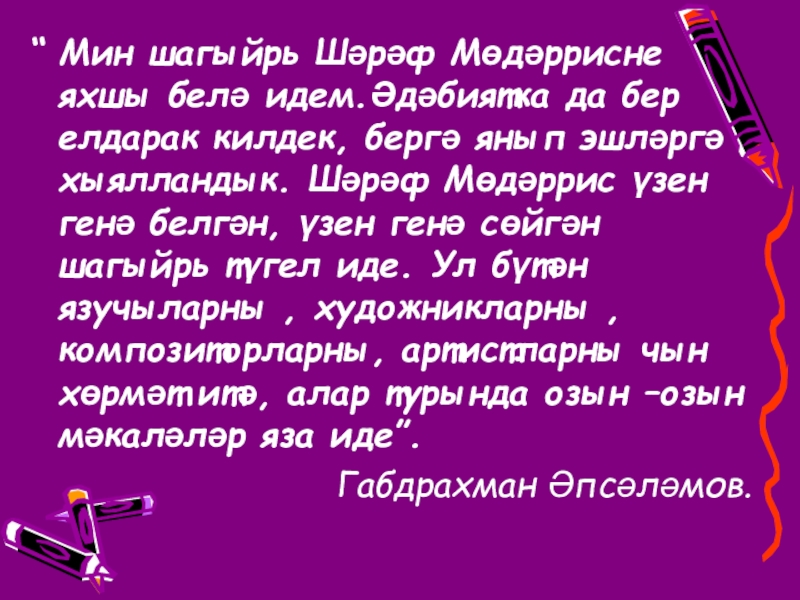 Слайд 15“ Мин шагыйрь Шәрәф Мөдәррисне яхшы белә идем.Әдәбиятка да бер елдарак