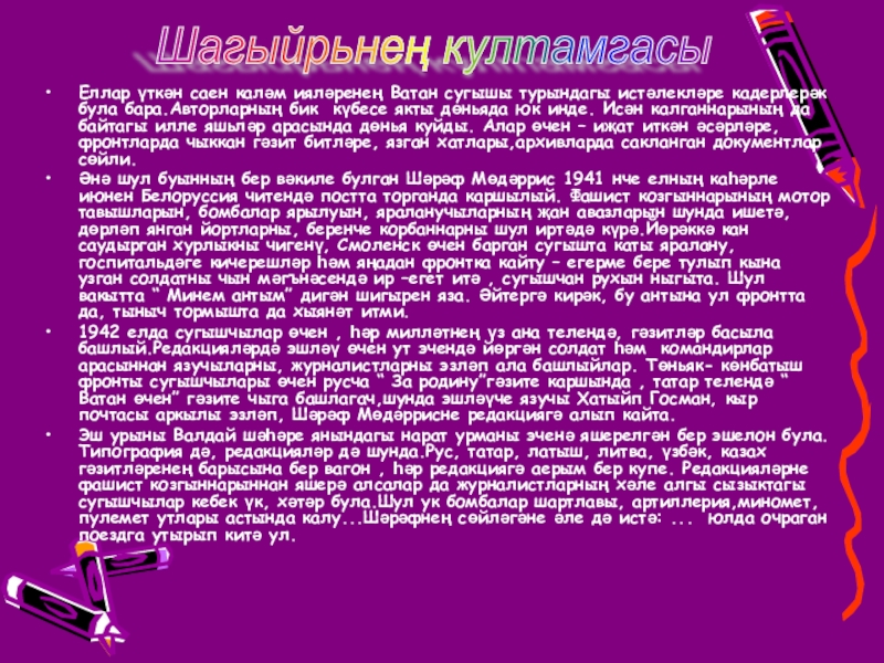 Слайд 18Еллар үткән саен каләм ияләренең Ватан сугышы турындагы истәлекләре кадерлерәк була