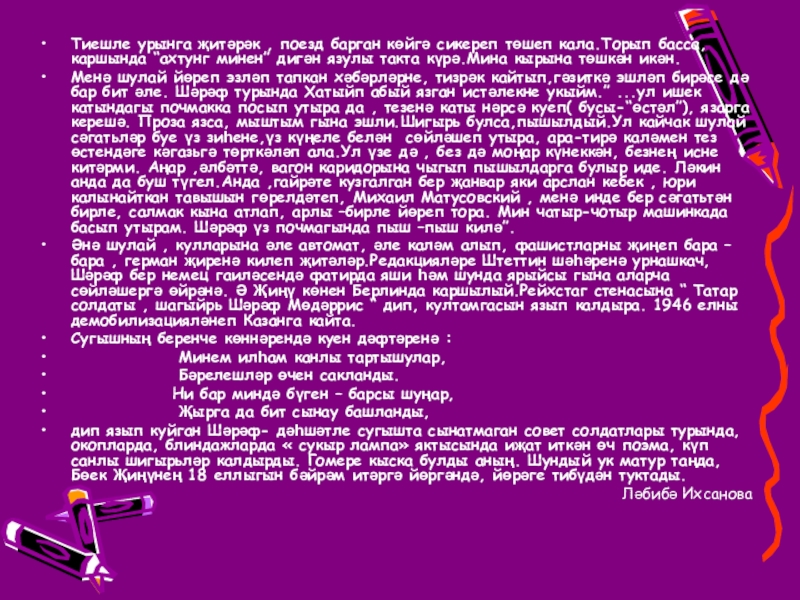 Менә шулай йөреп эзләп тапкан хәбәрләрне, тизрәк кайтып,гәзиткә эшләп бирәсе дә бар бит әле. Шәрәф турында Хатыйп абый язган истәлекне укыйм.” ...ул ишек катындагы почмакка посып утыра да , тезенә каты нәрсә куеп( бусы-“өстәл”), язарга керешә. Проза язса, мыштым гына эшли.Шигырь булса,пышылдый.Ул кайчак шулай сәгатьләр буе үз зиһене,үз күңеле белән сөйләшеп утыра, ара-тирә каләмен тез өстендәге кәгазьгә төрткәләп ала.Ул үзе дә , без дә моңар күнеккән, безнең исне китәрми. Аңар ,әлбәттә, вагон каридорына чыгып пышылдарга булыр иде. Ләкин анда да буш түгел.Анда ,гайрәте кузгалган бер җанвар яки арслан кебек , юри калынайткан тавышын гөрелдәтеп, Михаил Матусовский , менә инде бер сәгатьтән бирле, салмак кына атлап, арлы –бирле йөреп тора. Мин чатыр-чотыр машинкада басып утырам. Шәрәф үз почмагында пыш –пыш килә”.
