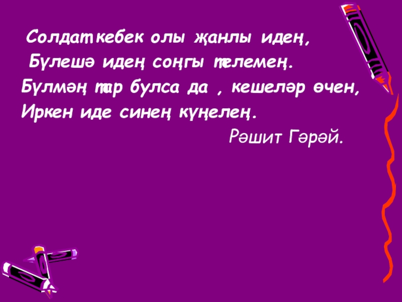 Слайд 14 Солдат кебек олы җанлы идең,
