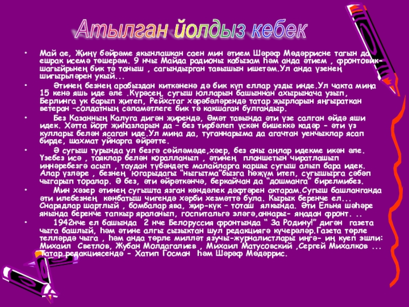да ешрак исемә төшерәм. 9 нчы Майда радионы кабызам һәм анда әтием , фронтовик- шагыйрьнең бик тә таныш , сагындырган тавышын ишетәм.Ул анда үзенең шигырьләрен укый...