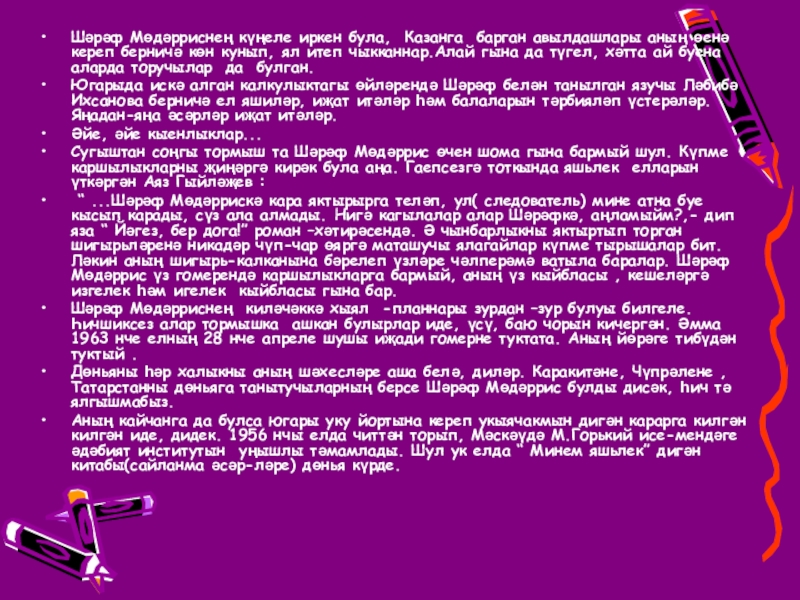Слайд 10Шәрәф Мөдәрриснең күңеле иркен була, Казанга барган авылдашлары аның өенә кереп