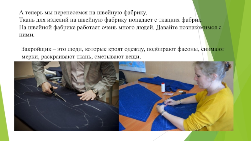 Закройщик – это люди, которые кроят одежду, подбирают фасоны, снимают мерки, раскраивают ткань, сметывают вещи.