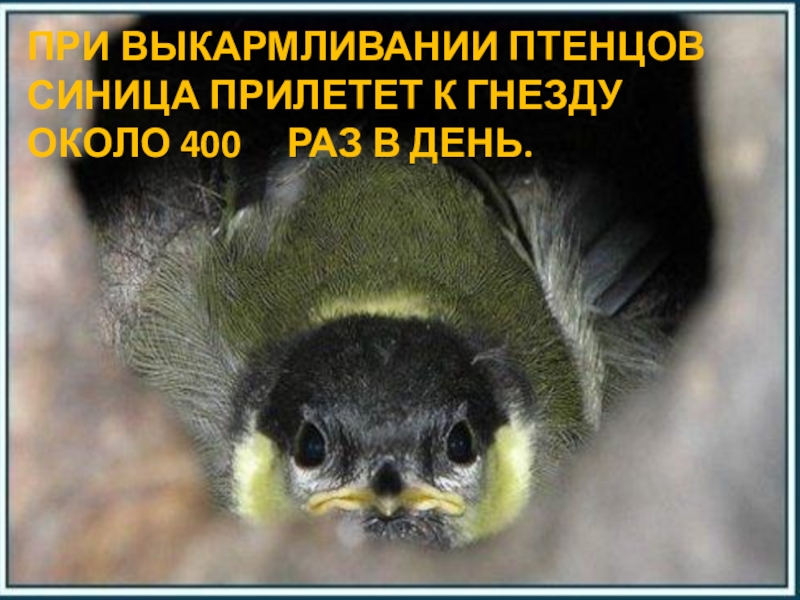 Слайд 30ПРИ ВЫКАРМЛИВАНИИ ПТЕНЦОВ СИНИЦА ПРИЛЕТЕТ К ГНЕЗДУ ОКОЛО 400