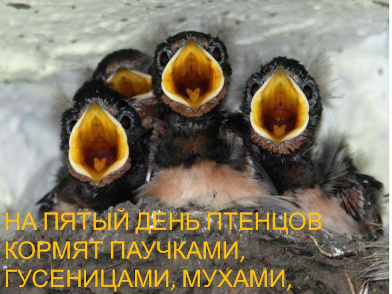 Слайд 26НА ПЯТЫЙ ДЕНЬ ПТЕНЦОВ КОРМЯТ ПАУЧКАМИ, ГУСЕНИЦАМИ, МУХАМИ, БАБОЧКАМИ…