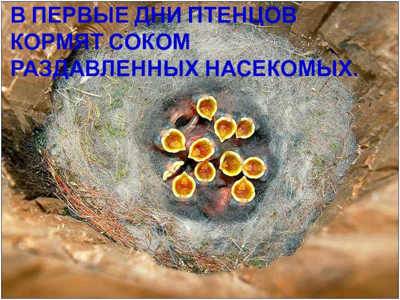 Слайд 25В ПЕРВЫЕ ДНИ ПТЕНЦОВ КОРМЯТ СОКОМ РАЗДАВЛЕННЫХ НАСЕКОМЫХ.