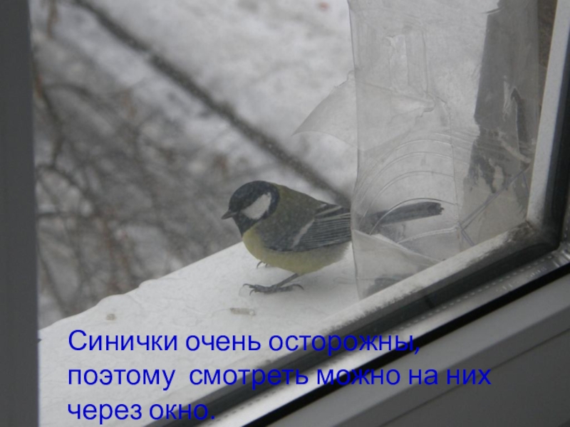 Слайд 5Синички очень осторожны, поэтому смотреть можно на них через окно.