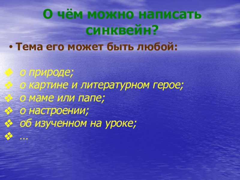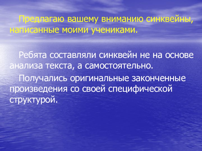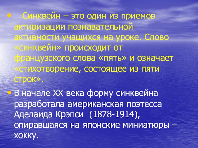 учащихся на уроке. Слово «синквейн» происходит от французского слова «пять» и означает «стихотворение, состоящее из пяти строк».