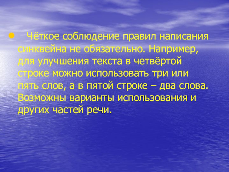 Слайд 5 Чёткое соблюдение правил написания синквейна не обязательно. Например, для