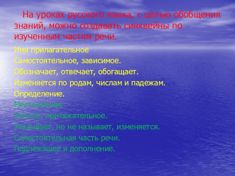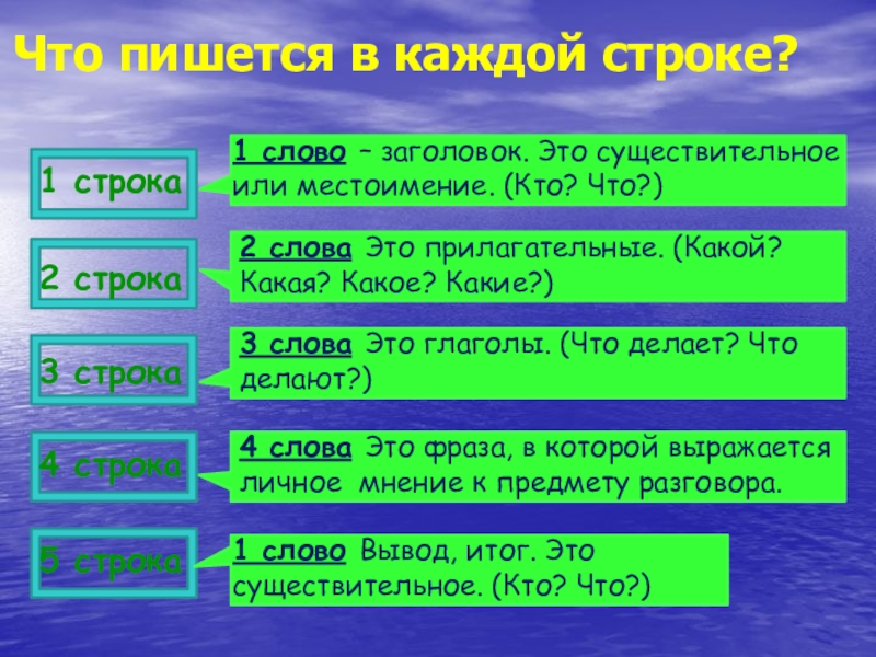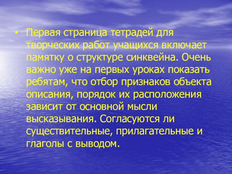 синквейна. Очень важно уже на первых уроках показать ребятам, что отбор признаков объекта описания, порядок их расположения зависит от основной мысли высказывания. Согласуются ли существительные, прилагательные и глаголы с выводом.