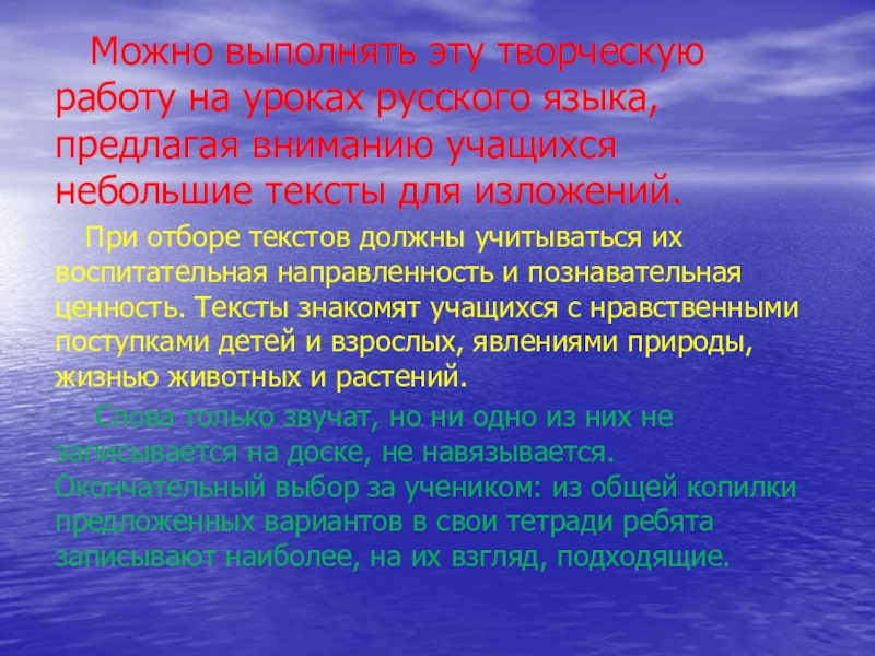 творческую работу на уроках русского языка, предлагая вниманию учащихся небольшие тексты для изложений.