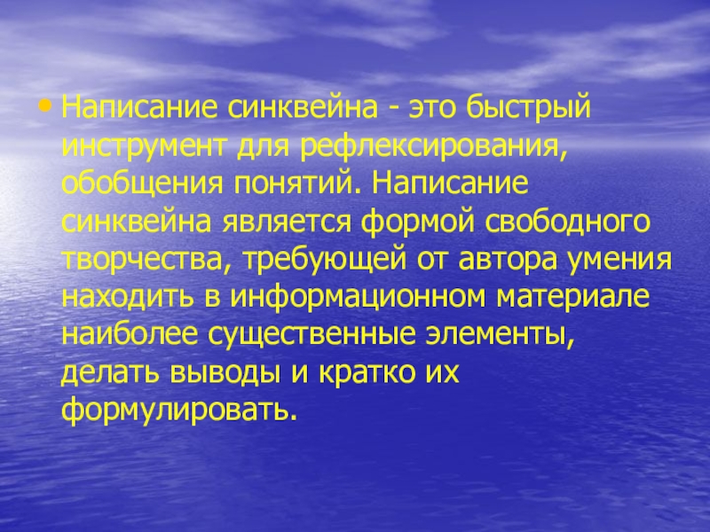 Слайд 7Написание синквейна - это быстрый инструмент для рефлексирования, обобщения понятий. Написание