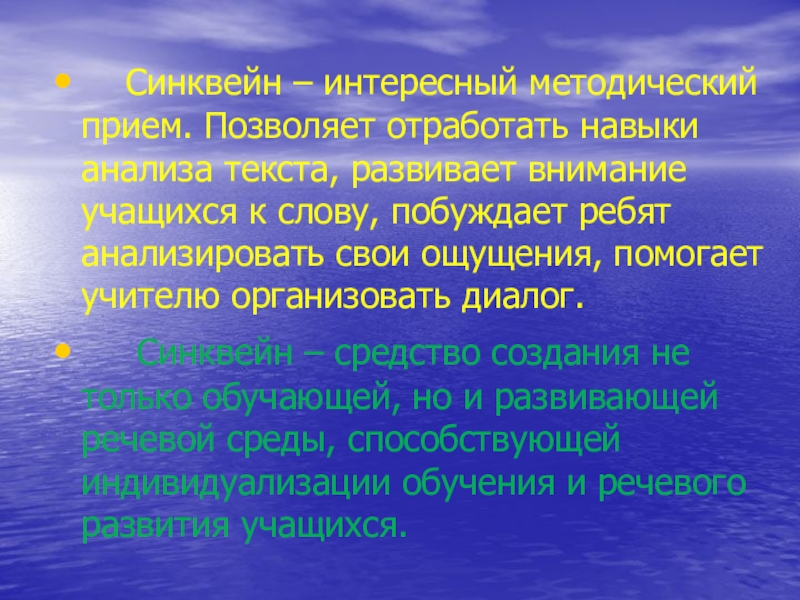 Синквейн – средство создания не только обучающей, но и развивающей речевой среды, способствующей индивидуализации обучения и речевого развития учащихся.