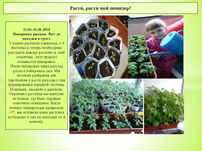 После пикировки наша рассада росла и набиралась сил. Мы вносили удобрения для укрепления и роста рассады и для формирования корневой системы. Поливали, закаляли и рыхлили.