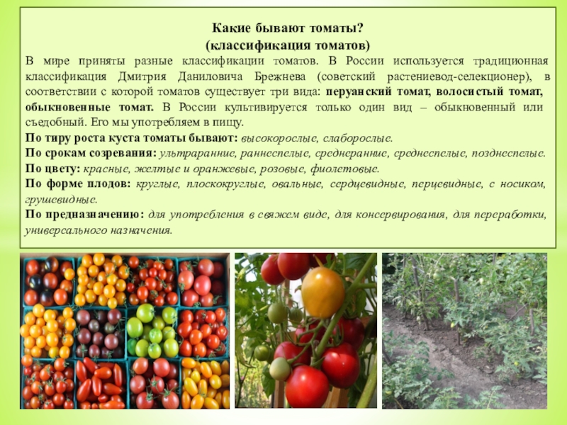 используется традиционная классификация Дмитрия Даниловича Брежнева (советский растениевод-селекционер), в соответствии с которой томатов существует три вида: перуанский томат, волосистый томат, обыкновенные томат. В России культивируется только один вид – обыкновенный или съедобный. Его мы употребляем в пищу.