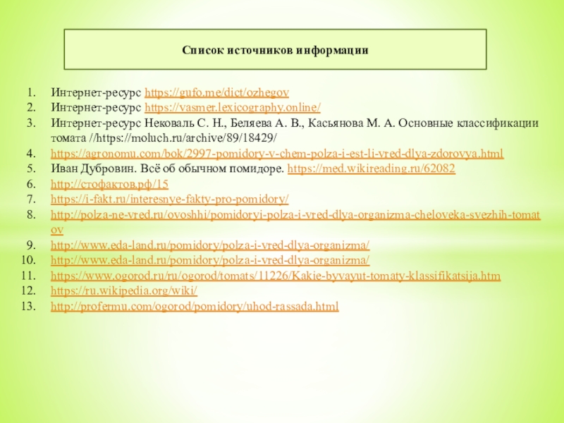 в книгах, энциклопедиях, интернете. Оказывается, помидор правильнее всего называть томатом, а помидор – это, всего лишь, томатный плод. Но прижилось именно название помидор. Помидор – родственник, кому бы вы думали? Как ни странно - табаку и картофелю.