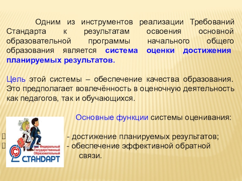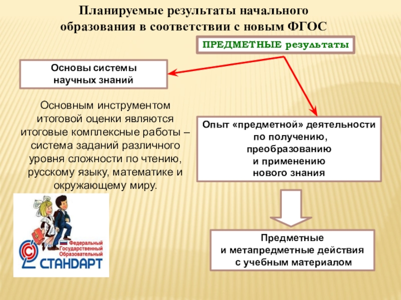 Основным инструментом итоговой оценки являются итоговые комплексные работы – система заданий различного уровня сложности по чтению, русскому языку, математике и окружающему миру.