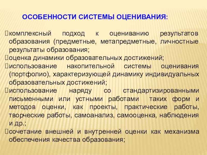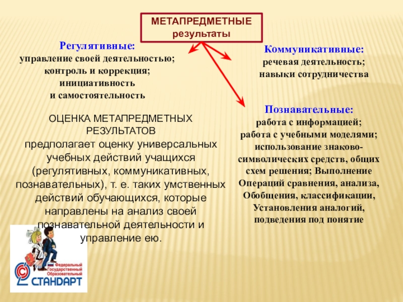 предполагает оценку универсальных учебных действий учащихся (регулятивных, коммуникативных, познавательных), т. е. таких умственных действий обучающихся, которые направлены на анализ своей познавательной деятельности и управление ею.