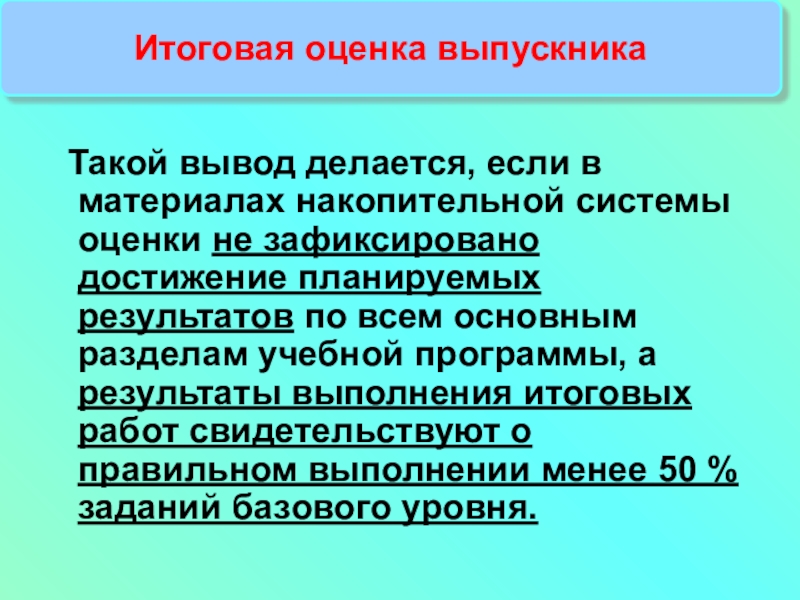 оценки не зафиксировано достижение планируемых результатов по всем основным разделам учебной программы, а результаты выполнения итоговых работ свидетельствуют о правильном выполнении менее 50 % заданий базового уровня.