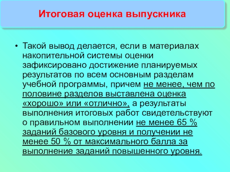 зафиксировано достижение планируемых результатов по всем основным разделам учебной программы, причем не менее, чем по половине разделов выставлена оценка «хорошо» или «отлично», а результаты выполнения итоговых работ свидетельствуют о правильном выполнении не менее 65 % заданий базового уровня и получении не менее 50 % от максимального балла за выполнение заданий повышенного уровня.