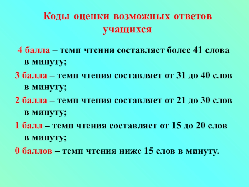 1 балл – темп чтения составляет от 15 до 20 слов в минуту;