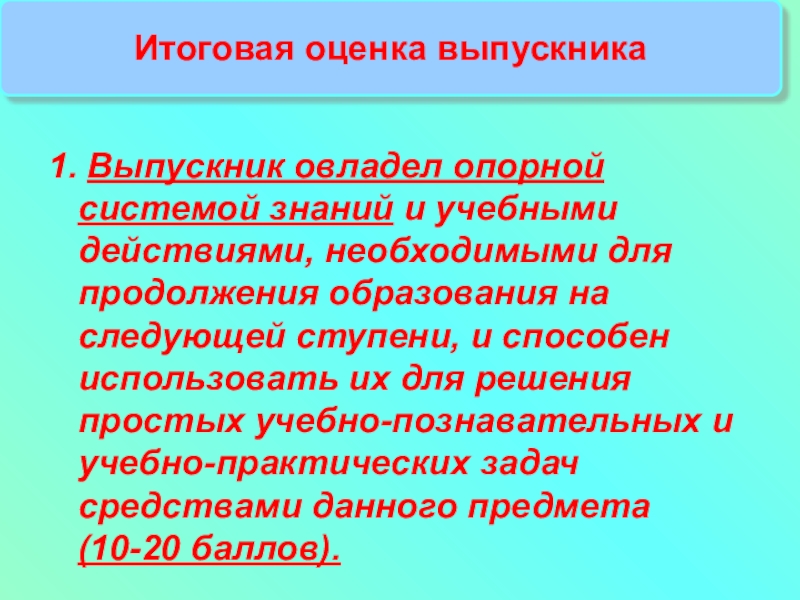 необходимыми для продолжения образования на следующей ступени, и способен использовать их для решения простых учебно-познавательных и учебно-практических задач средствами данного предмета (10-20 баллов).
