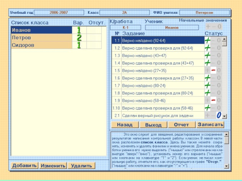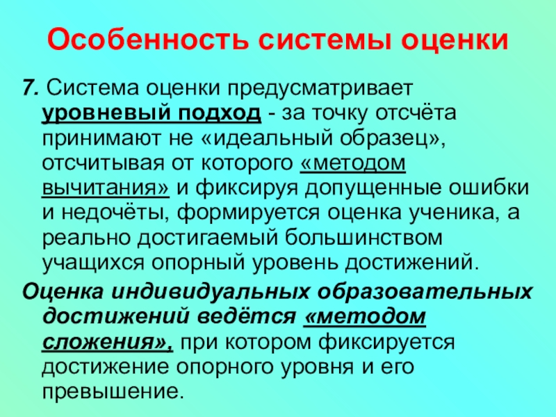отсчёта принимают не «идеальный образец», отсчитывая от которого «методом вычитания» и фиксируя допущенные ошибки и недочёты, формируется оценка ученика, а реально достигаемый большинством учащихся опорный уровень достижений.