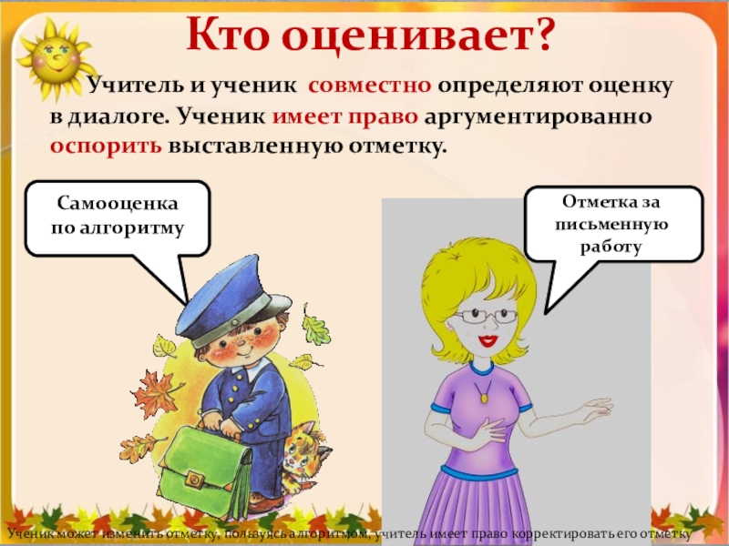 Ученик может изменить отметку, пользуясь алгоритмом, учитель имеет право корректировать его отметку