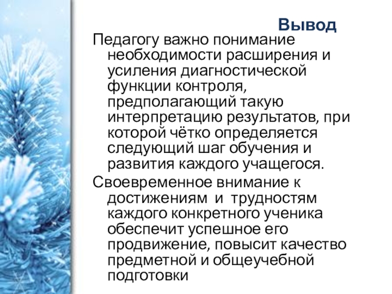 Педагогу важно понимание необходимости расширения и усиления диагностической функции контроля, предполагающий
