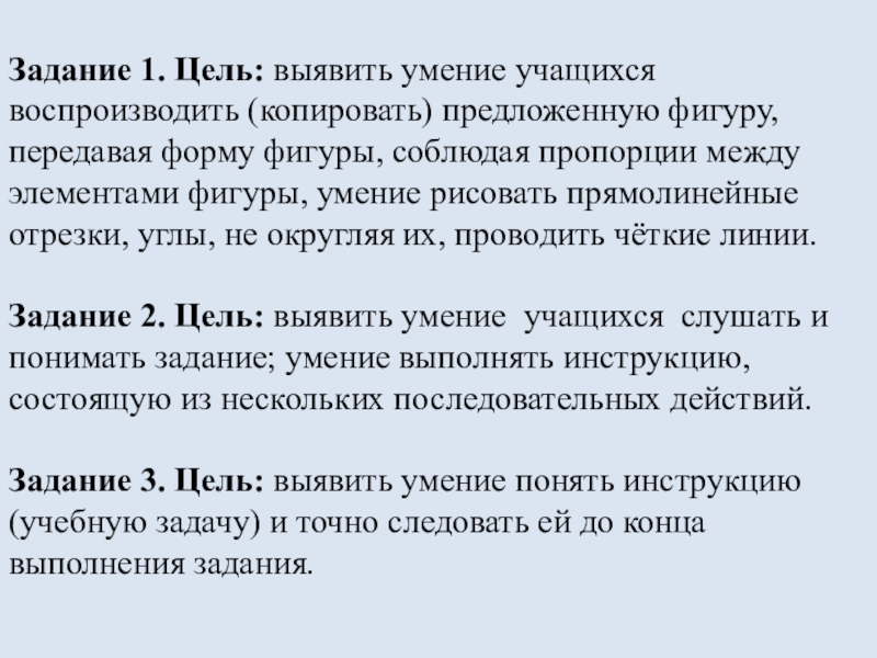 Задание 1. Цель: выявить умение учащихся воспроизводить (копировать) предложенную фигуру, передавая