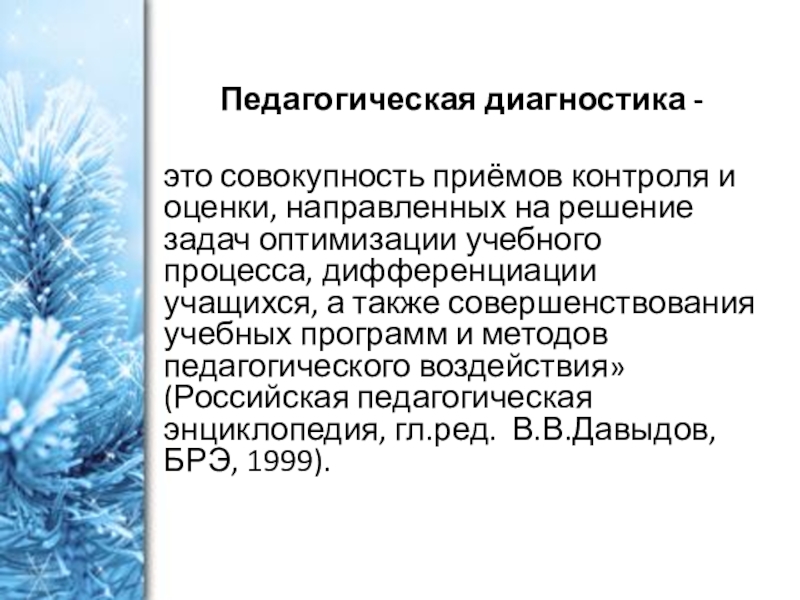 решение задач оптимизации учебного процесса, дифференциации учащихся, а также совершенствования учебных программ и методов педагогического воздействия» (Российская педагогическая энциклопедия, гл.ред. В.В.Давыдов, БРЭ, 1999).
